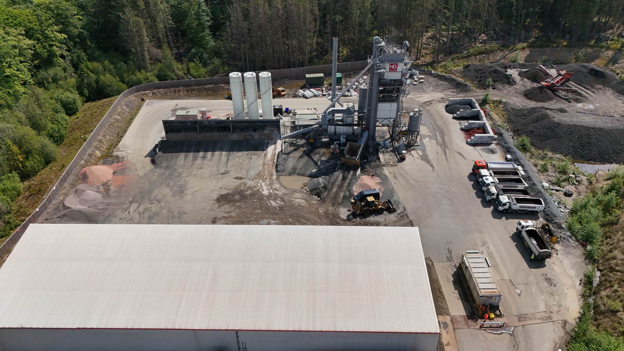 Aerial view of industrial site with warehouse, silos, construction vehicles, trucks, and surrounding trees.